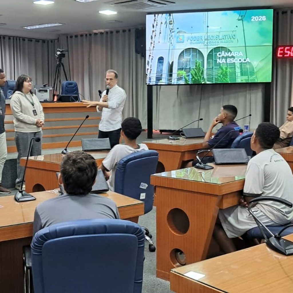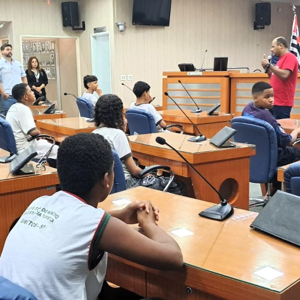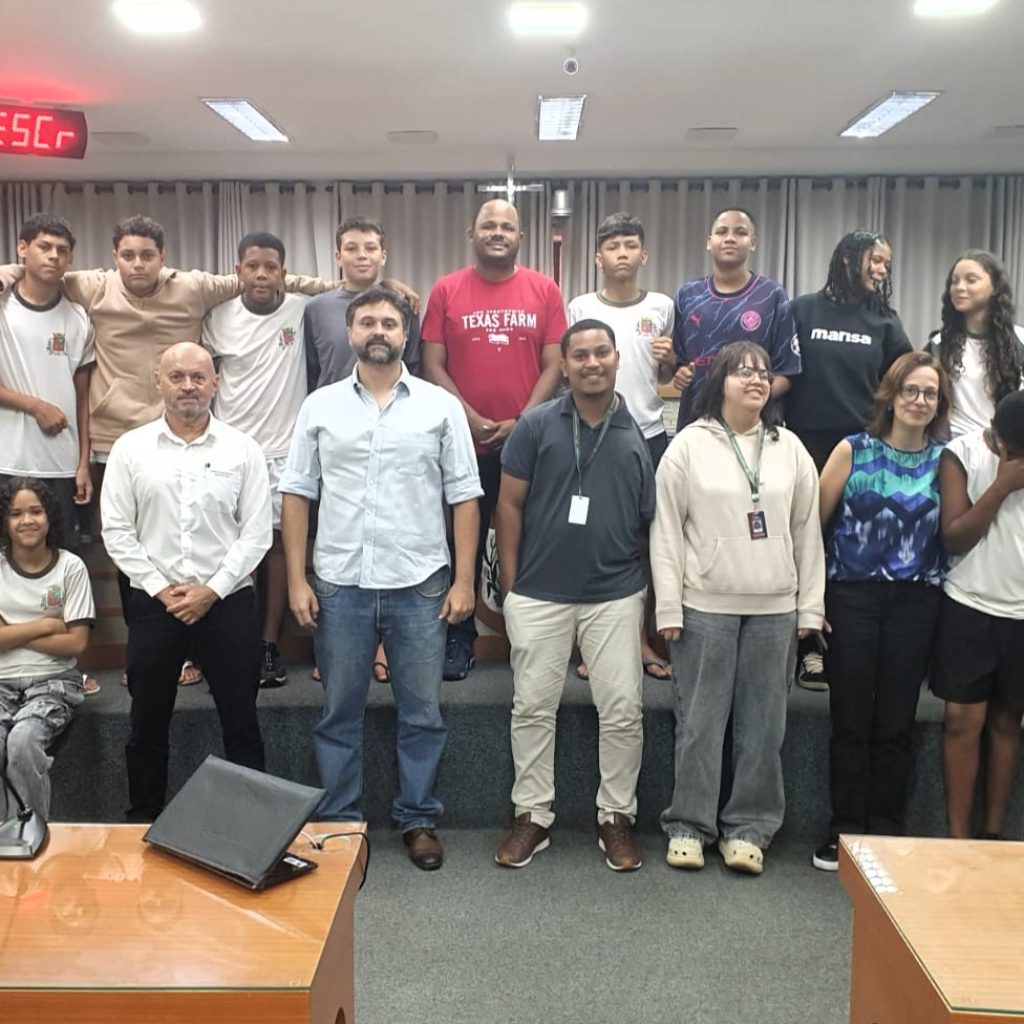 A turma do 8º ano D da Escola Municipal Prof. Giuseppe Carnímeo realizou, na última sexta-feira (10), uma visita guiada à Câmara Municipal, acompanhada pelo professor de História, Henrique Nunes. Os estudantes foram recepcionados pelo vereador Raphael Silvério, que destacou a importância do engajamento nos estudos.