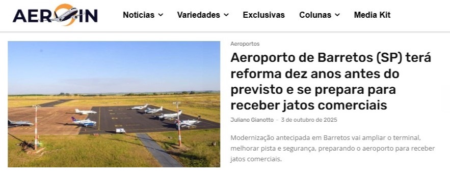 Já o Aeroin, maior site de aviação do Brasil e da América Latina, segundo os rankings SimilarWeb e Alexa by Amazon, destacou que as melhorias prepararão o Aeroporto de Barretos para receber jatos comerciais.
