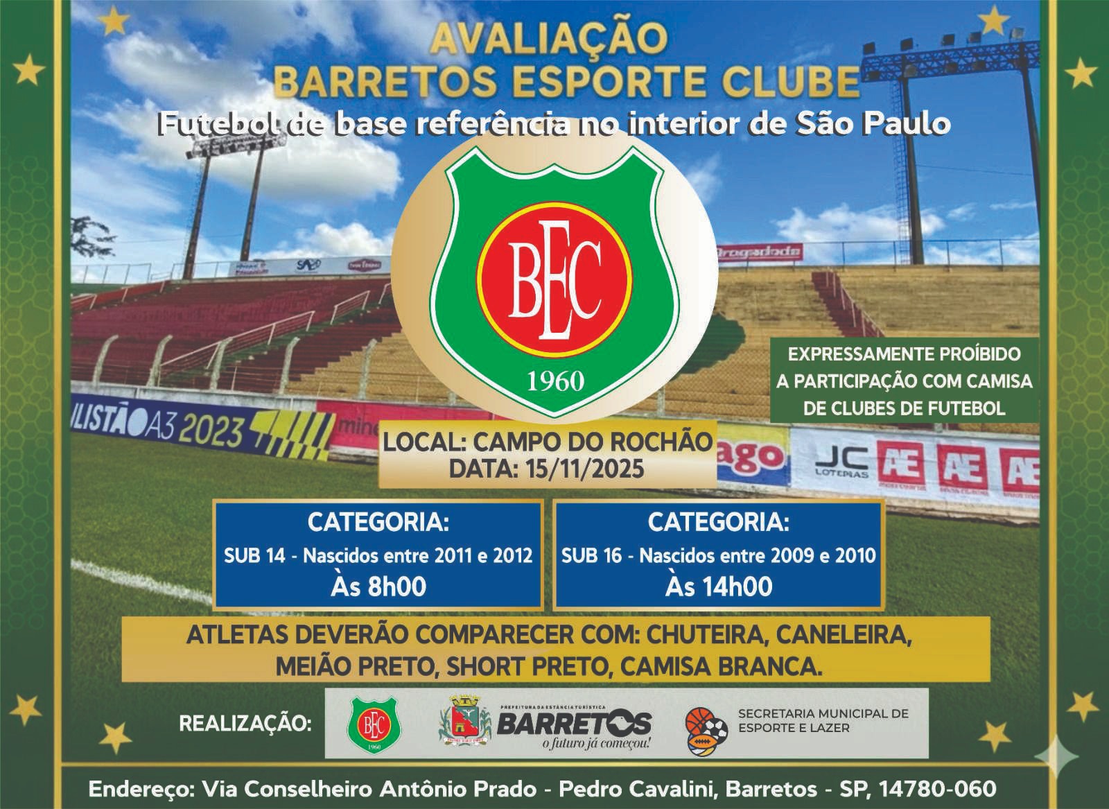 O Barretos Esporte Clube (BEC) realizará, no próximo dia 15 de novembro, no campo do Complexo Poliesportivo João Batista da Rocha – “Rochão”, a avaliação técnica de atletas para as categorias de base do Campeonato Paulista 2026.