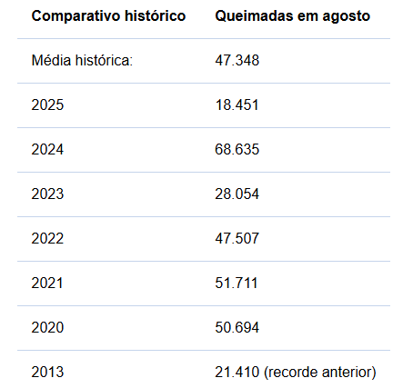 O Brasil alcançou uma redução histórica no número de queimadas registradas no mês de agosto. De acordo com dados do Instituto Nacional de Pesquisas Espaciais (Inpe), foram contabilizados 18.451 focos de calor, o menor índice desde o início do monitoramento, em 1998.