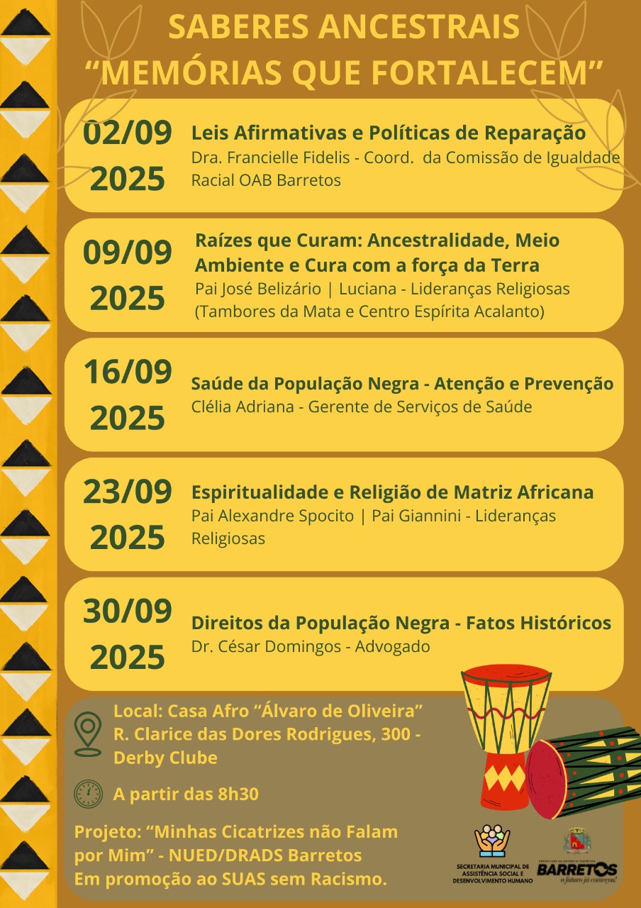 A Prefeitura da Estância Turística de Barretos, por meio da Secretaria Municipal de Assistência Social e Desenvolvimento Humano, informa a realização de uma série de encontros do projeto “Minhas Cicatrizes Não Falam por Mim”, promovido pelo Núcleo EducAxé (NUED) / DRADS – Barretos, na Casa Afro “Álvaro de Oliveira”.