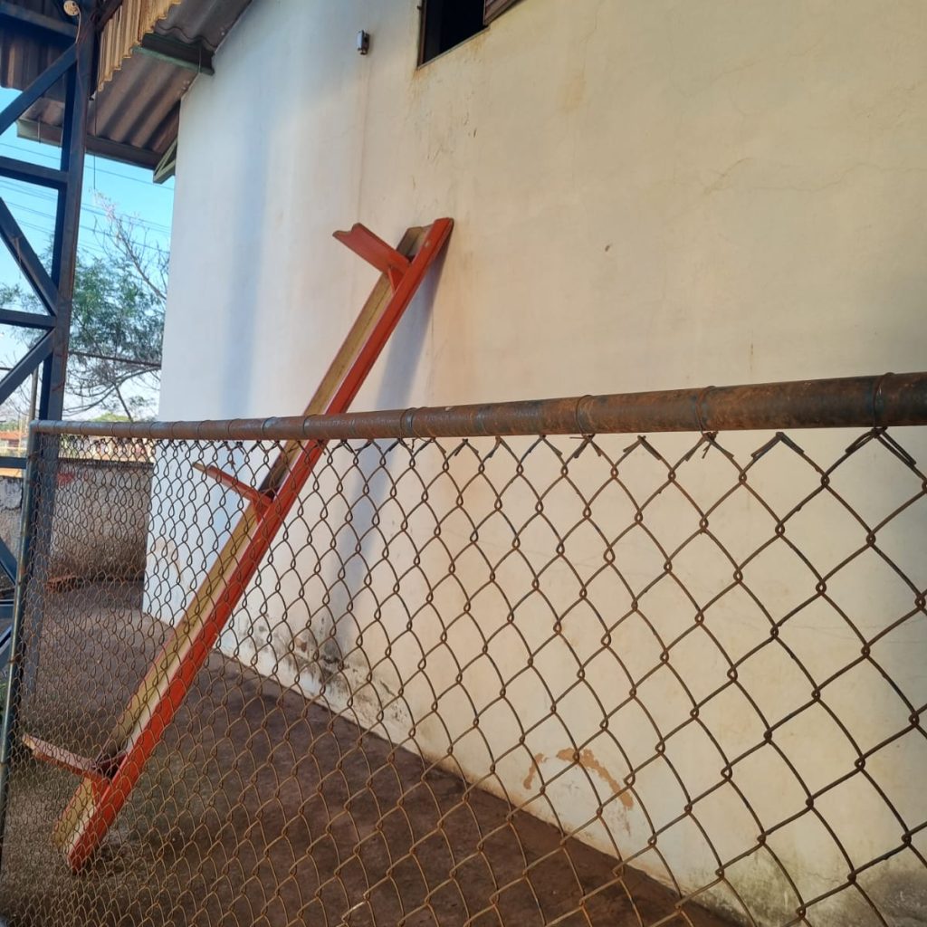 Durante a inspeção, também foi notada a porta do alçapão aberta, com um banco encostado na parede, indicando possível acesso ao local pelos criminosos.