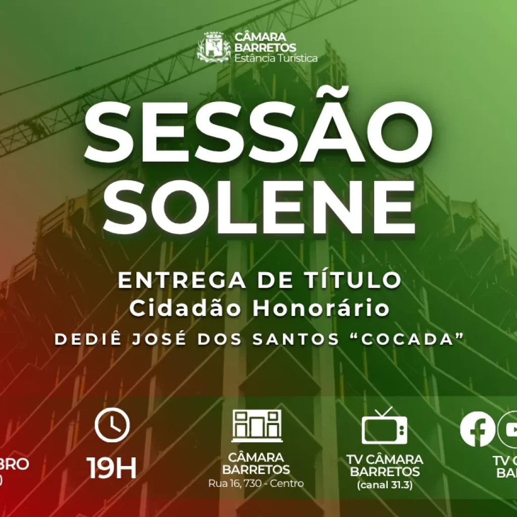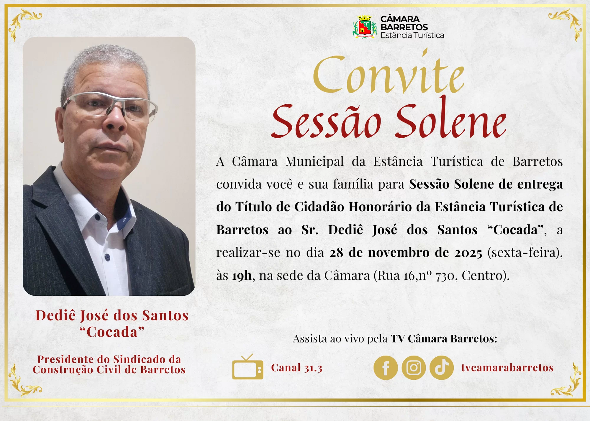 A Câmara Municipal de Barretos realiza no dia 28 de novembro (sexta-feira), às 19h, Sessão Solene para entrega do Título de Cidadão Honorário da Estância Turística de Barretos ao Sr. Dediê José dos Santos, conhecido como “Cocada”.