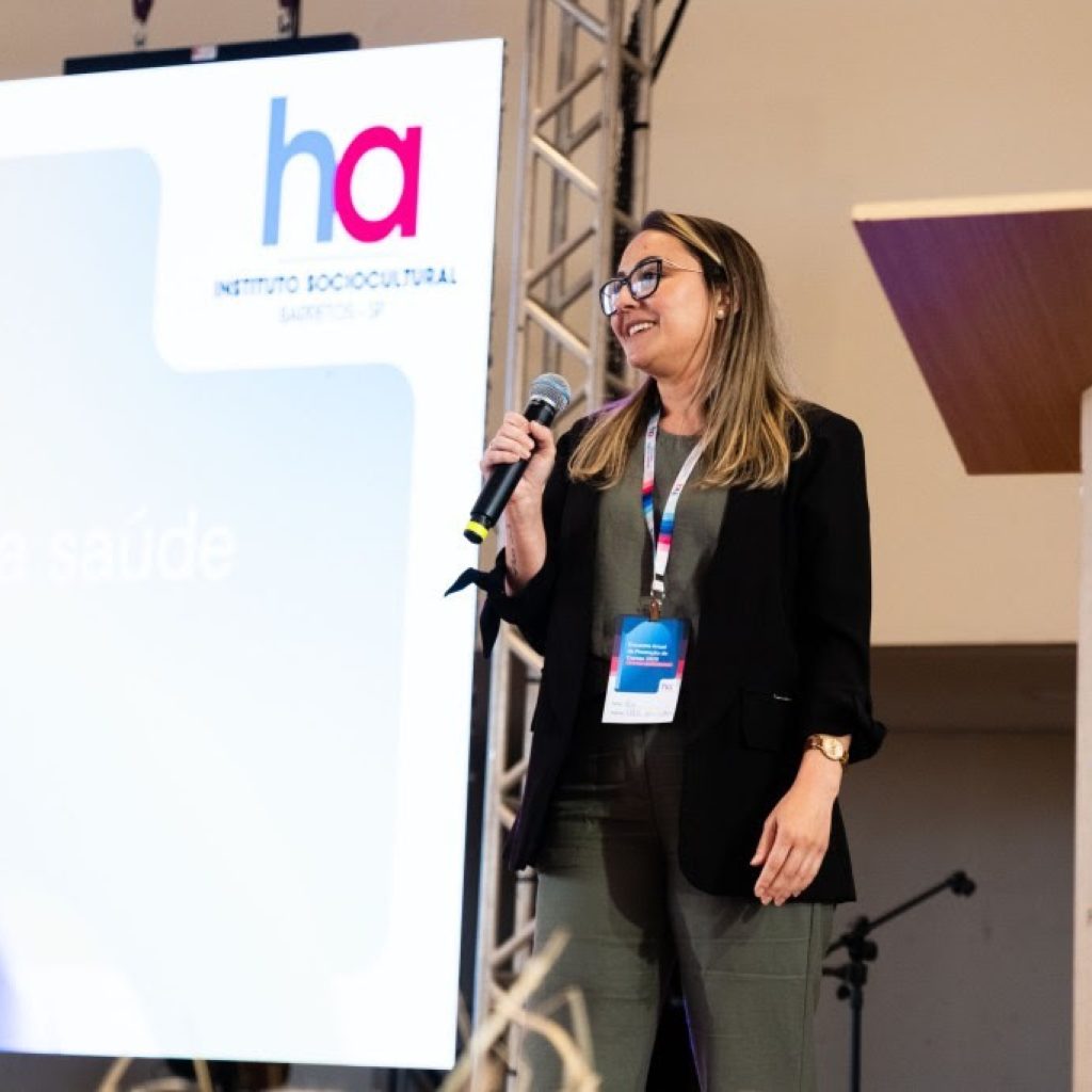 No palco, a coordenadora do Instituto, Aline Dias, destacou a missão da entidade fundada em 2008: integrar cultura e humanização para melhorar indicadores sociais e a qualidade de vida da população. O Instituto desenvolve mais de dez projetos ativos e permanentes, e outros tantos eventuais, que vão desde ações de acolhimento até atividades ligadas aos direitos humanos e à cultura, sempre com foco na humanização dos processos de prevenção, tratamento, ensino e pesquisa em oncologia.