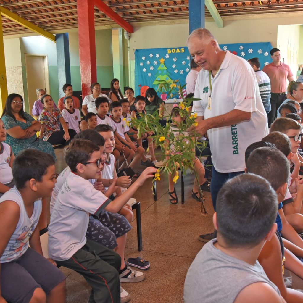 A iniciativa, que prevê a distribuição de cerca de 2,5 milhões de sementes de crotalária, foi apresentada aos alunos do 1º e 2º ano da Escola Municipal Matilde Gitay de Mello, na presença do prefeito Odair Silva, da primeira-dama Roselaine Silva e de secretários municipais.