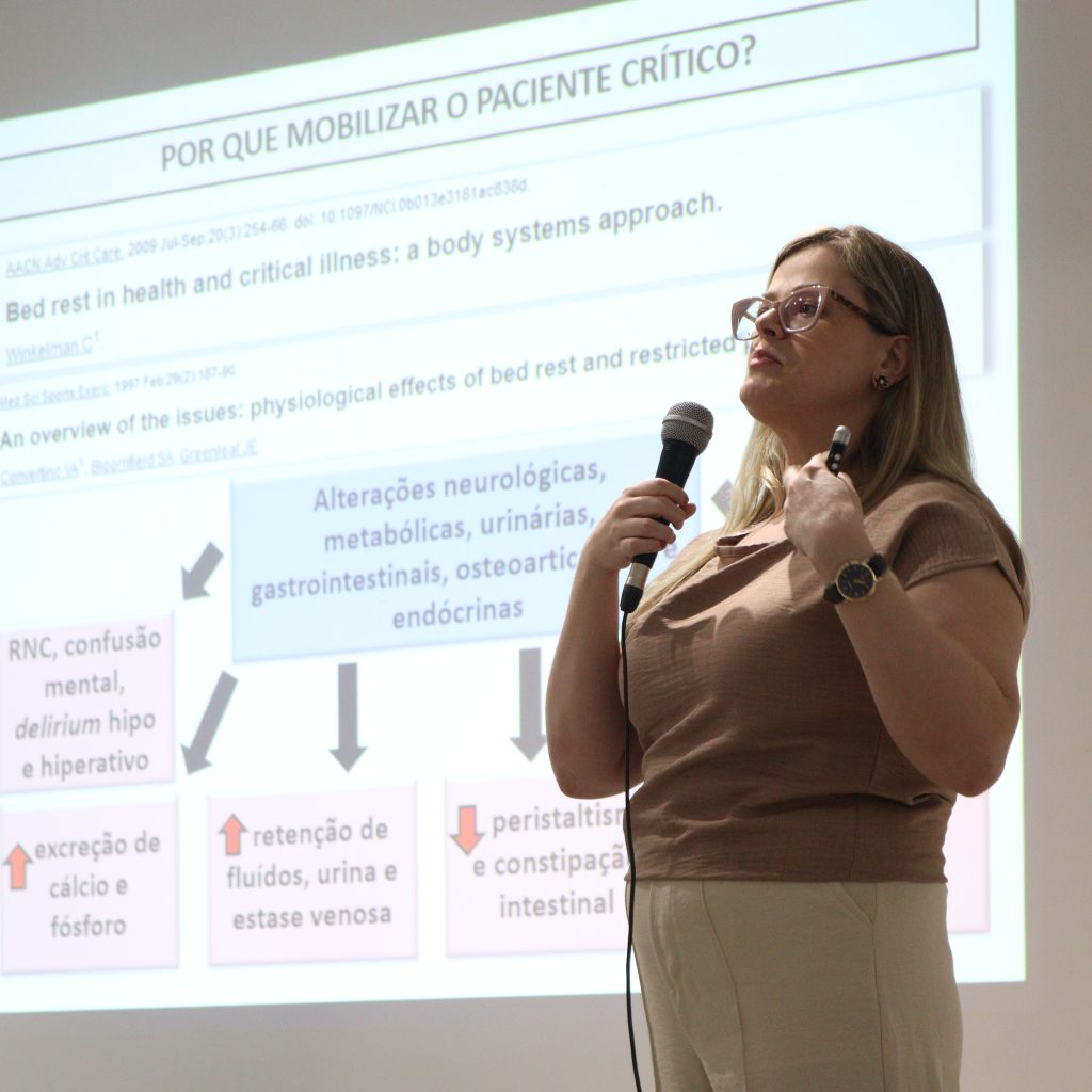 No segundo dia, com a Dra. Thaís Marina Pires de Campos Biazon, pós-doutoranda pela USP de Ribeirão Preto, foi ministrada a palestra “Mobilização precoce na unidade de terapia intensiva: por que, quando e como realizar”. A pesquisadora compartilhou evidências científicas e experiências clínicas sobre o impacto positivo da mobilização precoce na recuperação de pacientes em estado crítico, reforçando o papel essencial do fisioterapeuta na equipe multidisciplinar hospitalar.