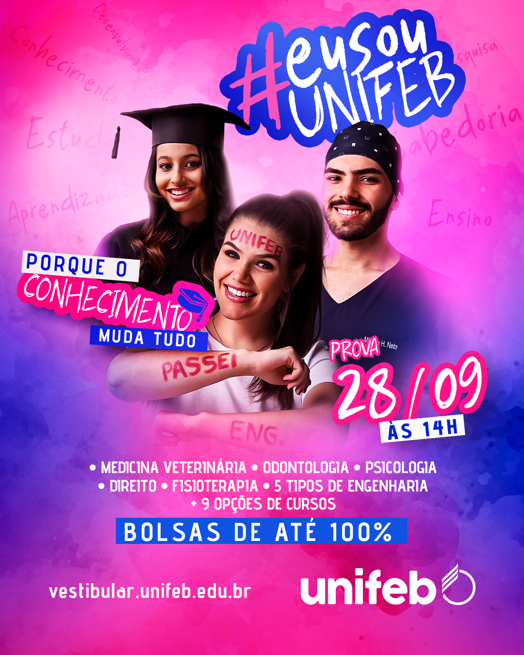 Com o mote “Eu sou UNIFEB. Porque o conhecimento muda tudo!”, a campanha celebra a importância da experiência universitária e ressalta o poder transformador do conhecimento. As inscrições para o vestibular devem ser realizadas pelo site www.vestibular.unifeb.edu.br, com isenção da taxa de participação. Outra opção para ingresso é via ENEM (Exame Nacional do Ensino Médio) permitindo que o candidato utilize a pontuação obtida na avaliação.